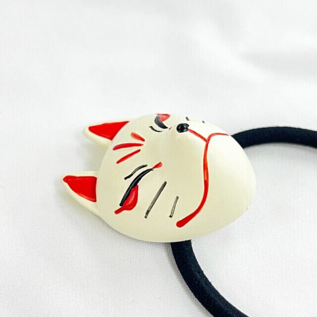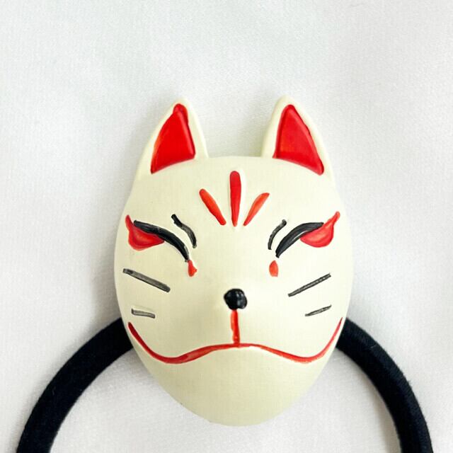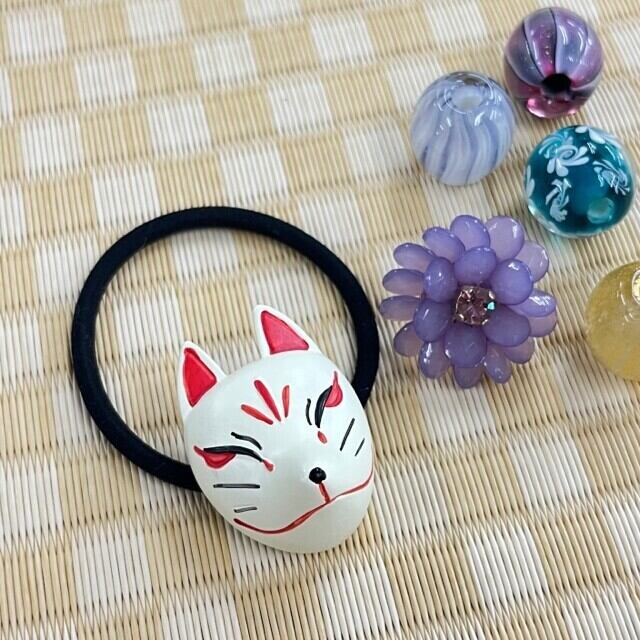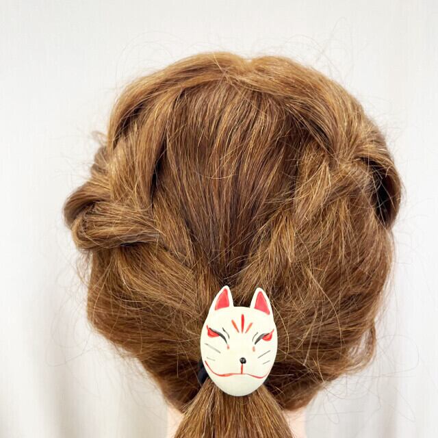 浴衣スタイルにさりげない個性を添える、狐面モチーフのゴムポニー。